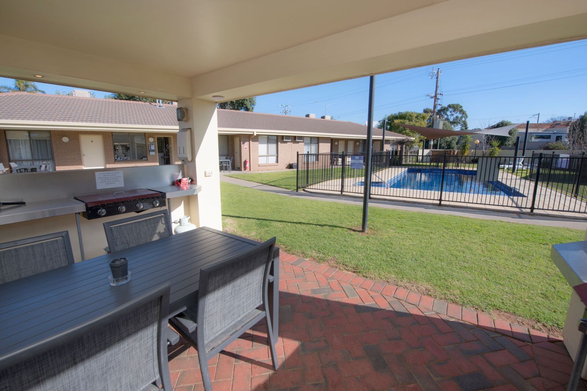 - Fenced pool area with shade sails and seating.
